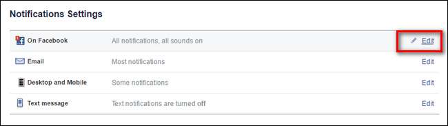 W menu „Powiadomienia” kliknij link „Edytuj” znajdujący się obok pozycji „Na Facebooku” u góry listy.