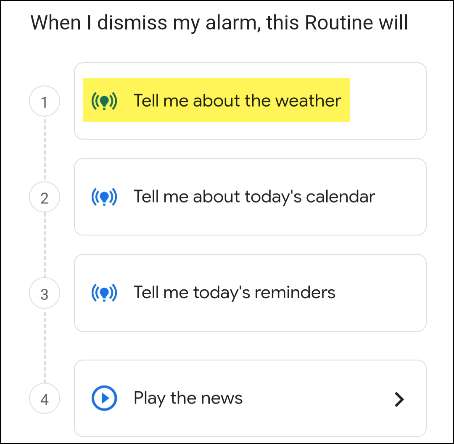 Ekran procedury tworzenia Asystenta Google otworzy się z kilkoma ustawieniami. Pierwszy jest "opowiedz mi o pogodzie", co dokładnie chcemy.