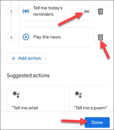 Zobaczysz także kilka innych pod spodem. Jeśli chcesz usunąć którekolwiek z tych działań lub zmienisz kolejność, w której zostaną recytowane, dotknij ikony ołówek.