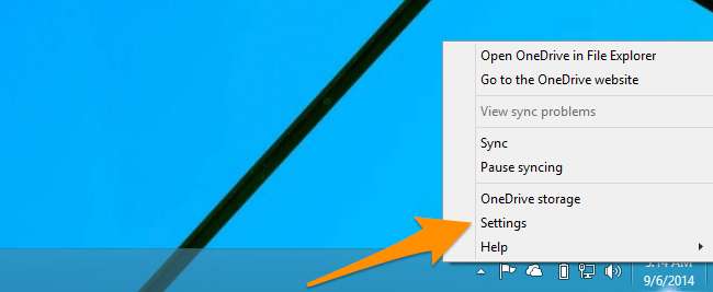 Aby jednak zmienić to ustawienie na domyślne, musisz szybko przejść do ustawień OneDrive, które można znaleźć, klikając prawym przyciskiem myszy ikonę OneDrive w zasobniku i wybierając Ustawienia.
