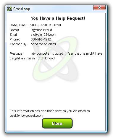 Gdy użytkownik prześle formularz, otrzymasz e-maila ze szczegółami jego pytania, ale możesz również otrzymać powiadomienie bezpośrednio od klienta CrossLoop, jeśli jest on uruchomiony: