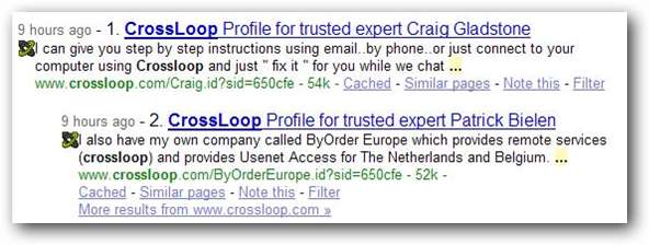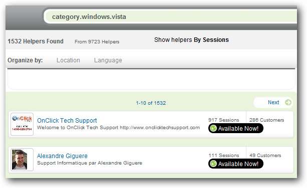 CrossLoop wyśle do Ciebie klientów… o ile nie zrezygnowałeś z usługi Marketplace, Twój profil pojawi się na rynku CrossLoop, aby potencjalni klienci mogli go znaleźć, szukając pomocy. Na przykład, gdy kliknąłem kategorię Windows Vista w sekcji „Potrzebuję pomocy”, pojawiła się duża lista pomocników.