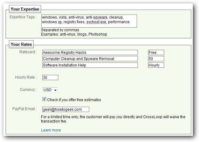 Zauważysz sekcję „Twoje stawki”, która jest bardzo ważna, aby wypełnić przydatne informacje. Możesz tutaj ustawić z góry ustaloną cenę za swoje usługi lub nawet wpisać „Skontaktuj się ze mną” jako stawkę. Możesz także utworzyć proste „pakiety”, takie jak „Czyszczenie komputera i usuwanie oprogramowania szpiegującego”, które pomogą ludziom zrozumieć niektóre z częściej świadczonych usług.