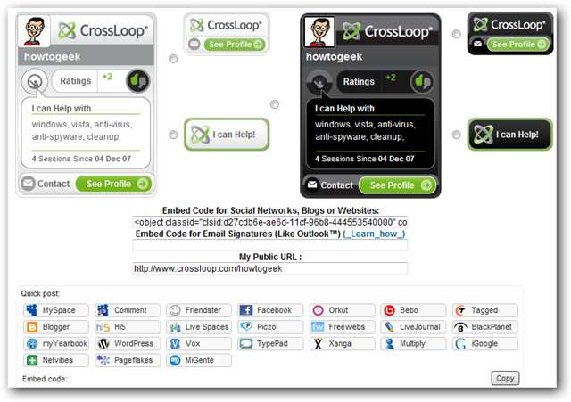 CrossLoop zapewnia mnóstwo widżetów, które możesz osadzić na swoim blogu, profilu MySpace lub na Facebooku lub w dziesiątkach innych miejsc. Ten widżet pokaże, w czym możesz pomóc, Twoje oceny i ma przycisk kontaktu, dzięki czemu ludzie mogą się z Tobą bezpośrednio skontaktować.