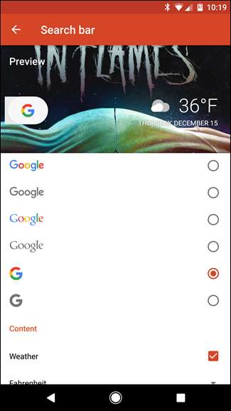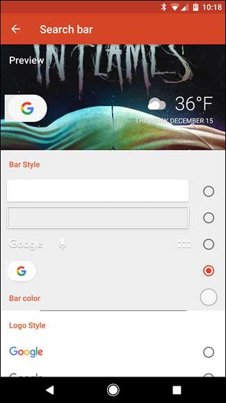 - Styl paska wyszukiwania: Wybierz logo „G” z białym owalem, a następnie dotknij „Kolor paska” i ustaw go na biały. Przewiń w dół i wybierz kolorowe „G.” Na koniec zaznacz pole „pogoda” na samym dole, a następnie wyjdź z tego menu.
