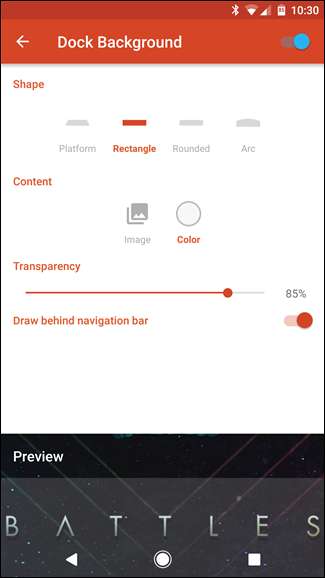 - Tło stacji dokującej: Wybierz „Prostokąt” jako kształt. Zmień kolor na biały, a następnie ustaw przezroczystość na 85%. Włącz „Rysuj za paskiem nawigacji”, a następnie wycofaj się.