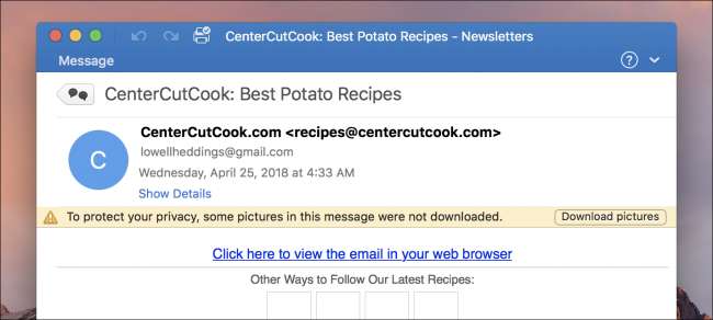 Aby zmienić ustawienie, otwórz Preferencje z paska menu, a następnie znajdź pozycję Czytanie. Na stronie Czytanie zmień ustawienie zabezpieczeń „Automatycznie pobieraj obrazy z internetu” na „w wiadomościach od moich kontaktów” - co jest prawdopodobnie rozsądnym ustawieniem - lub „we wszystkich wiadomościach”, jeśli po prostu nie chcesz tego nigdy kliknij ponownie przycisk Pobierz obrazy.