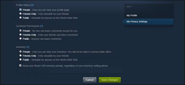 Tutaj możesz wybrać trzy opcje profilu Steam. Są dość oczywiste na stronie, oferując opcje całkowitej prywatności lub dostępu tylko do znajomych ze Steam. Jeśli nie chcesz, aby nikt nie oglądał Twoich gier, komentarzy ani zasobów reklamowych w publicznej sieci, wybierz opcję „Prywatne” dla wszystkich trzech. Przewiń w dół i kliknij „Zapisz zmiany”.
