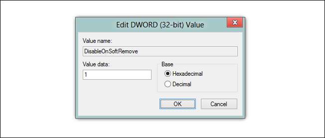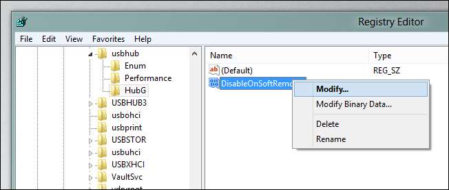 Teraz kliknij prawym przyciskiem myszy wartość DisableOnSoftRemove i wybierz opcję Modyfikuj ją z menu kontekstowego.