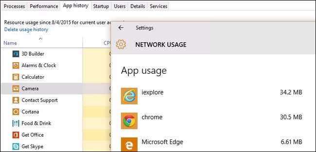 W Menedżerze zadań wybierz zakładkę „Historia aplikacji”. Znajdziesz tam dwie kolumny związane ze zużyciem danych: „Sieć” i „Sieć z pomiarem”. (Sieć z pomiarem to funkcja wprowadzona w systemie Windows 8.1, aby pomóc w zarządzaniu wykorzystaniem danych w ograniczonych / płatnych połączeniach danych, możesz przeczytać więcej na ten temat tutaj .)