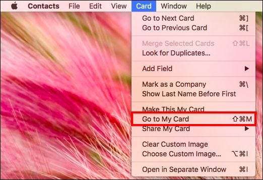 Jeśli masz dużo kontaktów i chcesz od razu przejść do swojej karty, kliknij menu „Karta”, a następnie „Idź do Mojej karty” lub naciśnij Shift + Command + M na klawiaturze.