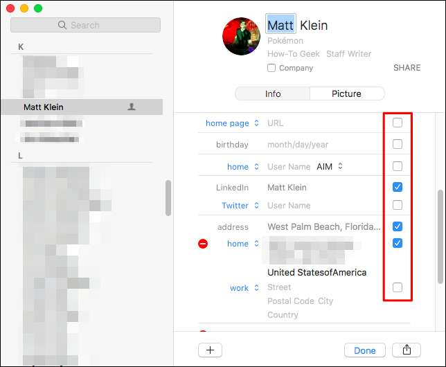 Gdy znajdziesz się w szczegółach karty, zobaczysz pola wyboru obok szczegółowych informacji o kontakcie. Odznacz wszystko, czego nie chcesz udostępniać na swojej prywatnej karcie „Ja”, a następnie kliknij „Gotowe”.