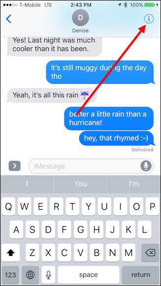 Co się stanie, jeśli hurtowo wyłączysz potwierdzenia przeczytania, ale nadal chcesz, aby jedna lub dwie osoby widziały, że przeczytałeś ich wiadomość? iOS 10 pozwoli Ci włączyć (lub wyłączyć) potwierdzenia odczytu na podstawie wiadomości. Aby to zrobić, otwórz dowolny wątek wiadomości w Wiadomościach i dotknij „i” w prawym górnym rogu.
