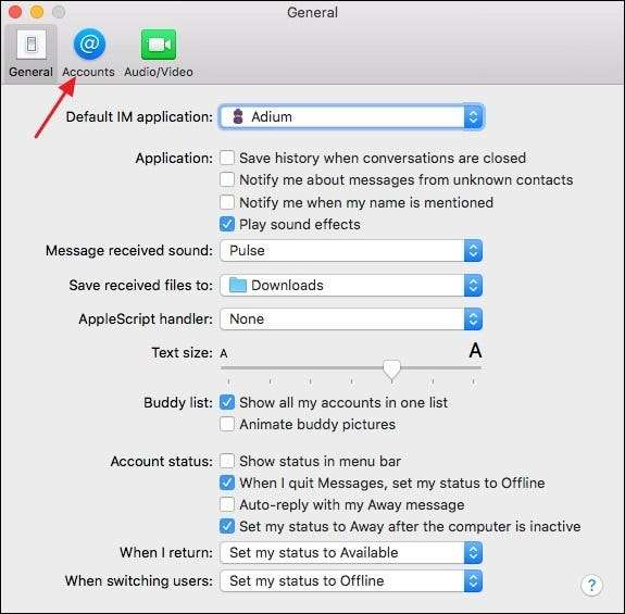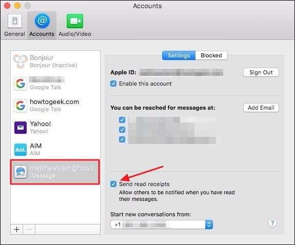 Na karcie Konta wybierz swoje konto iMessage po lewej stronie, a następnie po prawej wyłącz pole wyboru „Wysyłaj potwierdzenia odczytu”. Następnie możesz zamknąć okno Preferencje.