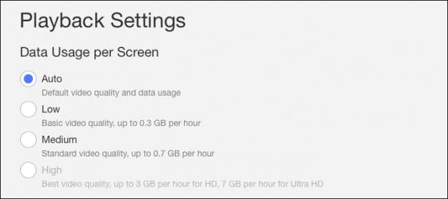 Zamiast tego, jeśli obawiasz się, ile usług przepustowości, takich jak Netflix, używają, będziesz chciał zmienić to w każdej z tych konkretnych usług. Na przykład otwórz ustawienia konta Netflix i zmień wykorzystanie danych w Ustawieniach odtwarzania. Inne usługi mogą mieć podobne ustawienia.