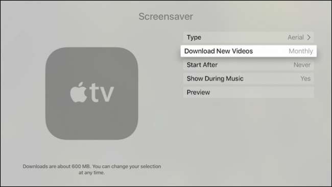Na przykład z powrotem na głównym ekranie wygaszacza ekranu możesz zobaczyć opcję Pobierz nowe filmy wideo, którą zobaczysz po wybraniu wygaszacza ekranu „Z lotu ptaka”.