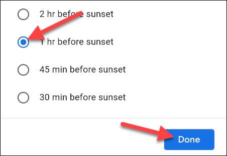 Następnie możesz zdecydować, jak używać czasu wschodu / zachodu słońca. Wybierz "Kiedy słońce ustawia się" lub "kiedy wznosi się słońce".