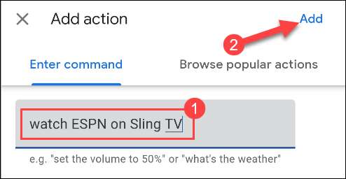 Zobaczysz listę kategorii dla rzeczy, które Google Assistant. Na dole możesz wybrać "Spróbuj dodać własną", aby wprowadzić niestandardowe polecenie. Na przykład możesz wejść do "Oglądaj ESPN na TV Sling TV", aby automatycznie obejrzeć swój ulubiony kanał podczas jedzenia śniadania. Stuknij "Dodaj", gdy skończysz.