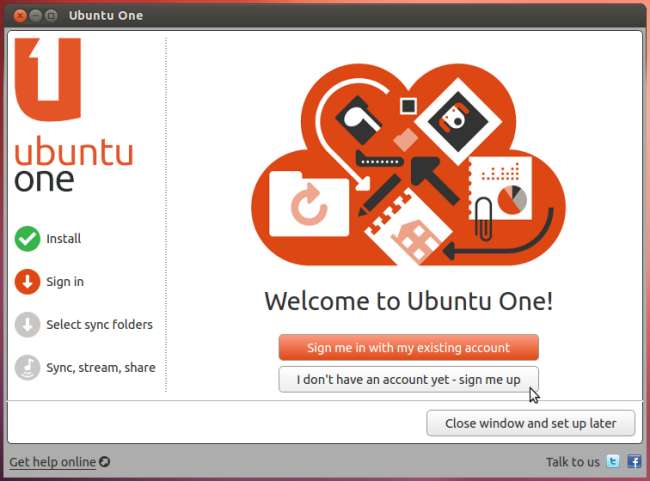 Ubuntu One korzysta z usługi jednokrotnego logowania Ubuntu. Jeśli masz już konto Launchpad lub inne konto jednokrotnego logowania Ubuntu, możesz zalogować się przy użyciu istniejącego konta. Jeśli nie masz jeszcze konta, kliknij Nie mam jeszcze konta - zarejestruj mnie przycisk, aby utworzyć go z poziomu aplikacji.