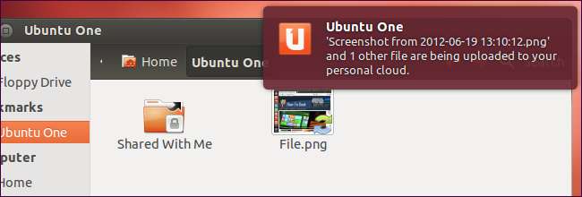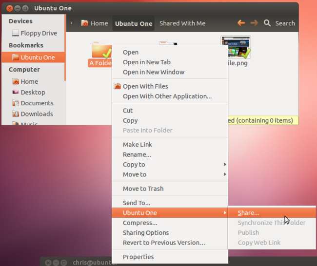 Po włączeniu możesz umieścić pliki w folderze Ubuntu One w katalogu domowym, aby zsynchronizować je z kontem Ubuntu One online. Możesz także użyć aplikacji Ubuntu One, aby określić różne foldery, które chcesz zsynchronizować - lub kliknij prawym przyciskiem myszy folder w przeglądarce plików Ubuntu, wskaż Ubuntu One i wybierz Synchronizuj ten folder.