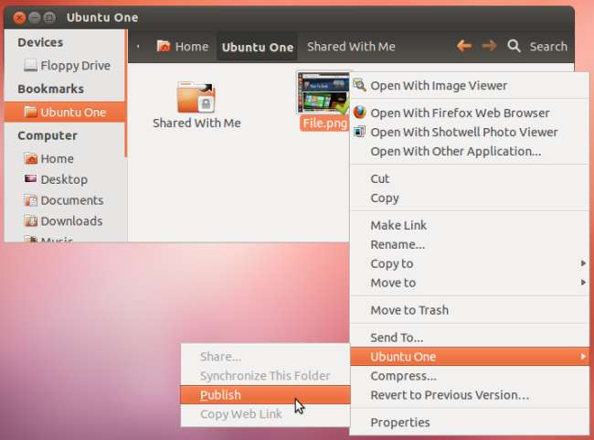 Aby opublikować plik online z menedżera plików Nautilus w Ubuntu, kliknij plik prawym przyciskiem myszy, wskaż podmenu Ubuntu One i wybierz Publikuj. Musisz wybrać plik, który jest już synchronizowany z Ubuntu One - jeśli nie jest synchronizowany, możesz przenieść go do folderu Ubuntu One.
