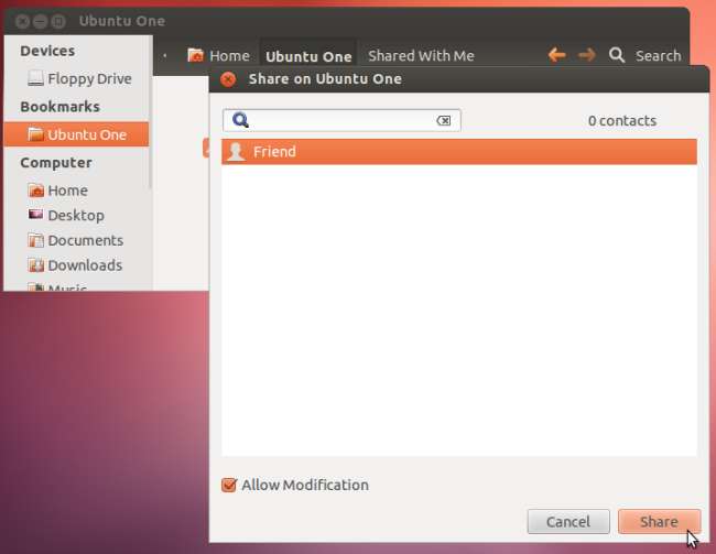 Możesz także udostępniać foldery z jednym lub kilkoma określonymi adresami e-mail. Każdy, komu udostępniasz folder, otrzyma e-maila z powiadomieniem. Jeśli nie mają jeszcze konta Ubuntu One, zostaną poproszeni o zarejestrowanie się. Udostępnione foldery pojawiają się w folderze Współdzielone ze mną w folderze Ubuntu One i zostaną zsynchronizowane z komputerami każdej osoby, gdy ta zaloguje się online. Możesz udostępniać foldery w trybie tylko do odczytu lub zezwalać innym na ich modyfikowanie.