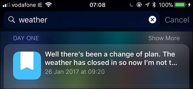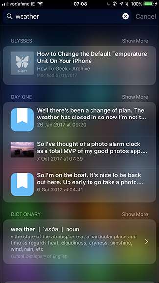 Chociaż może to być przydatne, może również oznaczać, że zawartość aplikacji, które wcześniej chcesz zachować jako prywatne, może się wyświetlić. Szukałem „pogoda” na moim iPhonie i otrzymałem jeden wynik z mojej aplikacji do pisania, Ulisses , co jest przydatne i trzy wyniki z mojego dziennika, Dzień pierwszy , co jest nieco przerażające. Kto wie, co by się pokazało, gdybym szukał czegoś takiego jak „Justin Pot”!