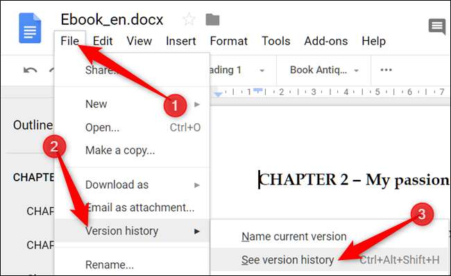 Otwórz menu „Plik”, kliknij podmenu „Historia wersji”, a następnie kliknij polecenie „Zobacz historię wersji”. Alternatywnie możesz nacisnąć Ctrl + Alt + Shift + H.
