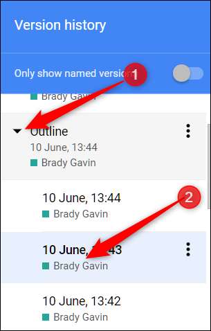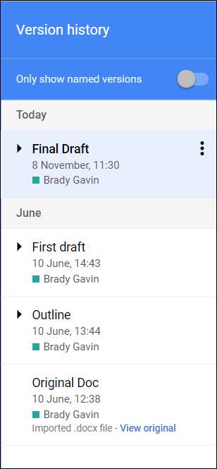 Wersje pliku są pogrupowane z powiązanymi zmianami po prawej stronie okna. W zależności od tego, jak bardzo jesteś skrupulatny, mogą mieć nazwy własne lub po prostu zostać posortowane według czasu ich utworzenia. Każda wersja to zbiór zmian, które są pogrupowane i scalane na podstawie wieku pliku lub rozmiaru każdej wersji. Ma to na celu zaoszczędzenie miejsca na serwerach Google.