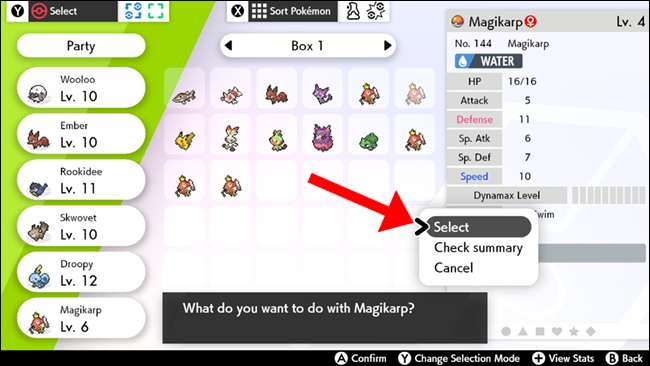 Można wybrać Pokémona w partii (po lewej) lub którykolwiek z danymi przechowywanymi w swoich skrzynkach. Naciśnij przycisk A na prawym kontrolerze Joy-Con, aby wybrać Pokémon, który chcesz handlu, a następnie wybierz opcję „Wybierz” z menu, aby potwierdzić.