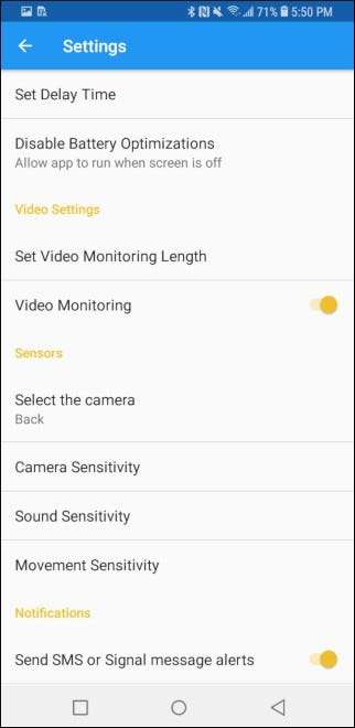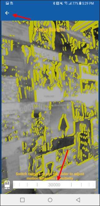 Następnie potrząśnij telefonem lub użyj suwaka na dole, aby ustawić dostrojenie wykrywania ruchu. Umożliwi to aparatowi rozpoczęcie nagrywania, jeśli telefon się poruszy, na przykład gdy intruz zacznie walić w ścianę domu. Naciśnij przycisk „Wstecz” w lewym górnym rogu jeszcze raz.