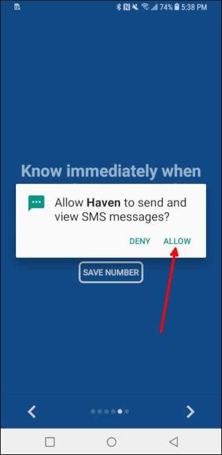 Przewiń pozostałe ekrany wprowadzenia. Przyznaj uprawnienia do wysyłania i przeglądania wiadomości SMS, jeśli chcesz, aby alerty SMS były wysyłane na Twój podstawowy telefon, a następnie wprowadź swój numer telefonu. Aby wysyłać wiadomości SMS, musisz mieć zainstalowaną aktywną kartę SIM lub możesz skonfigurować Signal dla alertów w ustawieniach aplikacji (więcej na ten temat za chwilę), jeśli używasz tylko połączenia internetowego.