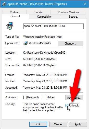 Wyświetlone zostanie okno dialogowe Właściwości. W systemie Windows 10 na karcie Ogólne zaznacz pole wyboru „Odblokuj”, aby w polu znajdował się znacznik wyboru. W Windows 7 i 8 / 8.1 kliknij przycisk „Odblokuj” w zakładce Ogólne. Kliknij OK".
