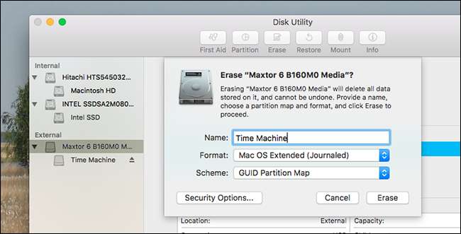 Pierwszą rzeczą, którą musisz zrobić, jest przygotowanie dysku zewnętrznego do pracy z Time Machine. Następnie podłącz dysk do komputera Mac uruchom Narzędzie dyskowe . Wybierz dysk zewnętrzny, a następnie kliknij przycisk „Wymaż”. Będziesz chciał sformatować dysk jako „Mac OS Extended”, znany również jako HFS +.