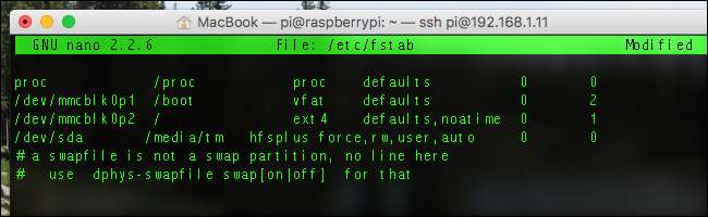 … A następnie dodaj informacje do pliku fstab. Użyj tego polecenia, aby otworzyć edytor tekstu: