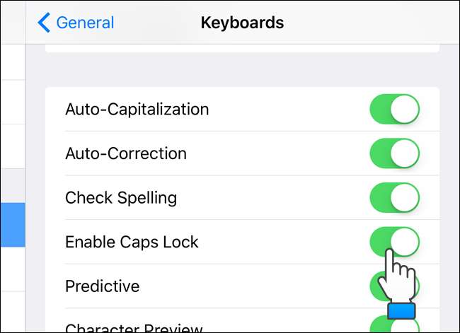 W sekcji „Klawiatury” przewiń w dół i kliknij suwak „Włącz Caps Lock”, aby go wyłączyć. Przycisk suwaka zmienia kolor na szary i biały, gdy jest wyłączony.
