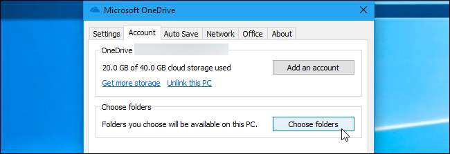 OneDrive niekoniecznie pokazuje wszystkie Twoje pliki i foldery w Eksploratorze plików. Aby wybrać, które ma się wyświetlać, kliknij kartę „Konto” w oknie ustawień OneDrive i kliknij przycisk „Wybierz foldery”.