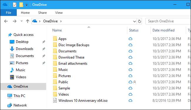 Istnieje nowa kolumna „Stan”, która pojawia się tylko w folderze OneDrive. To pokazuje stan Twoich plików i folderów - czy są „Dostępne w trybie online” (ikona chmury), „Dostępne na tym urządzeniu” (zielony znacznik wyboru) czy „Synchronizowanie” (niebieska ikona odświeżania lub pasek postępu ). Możesz także najechać kursorem myszy na te ikony, aby zobaczyć podpowiedź wyjaśniającą, co oznaczają.