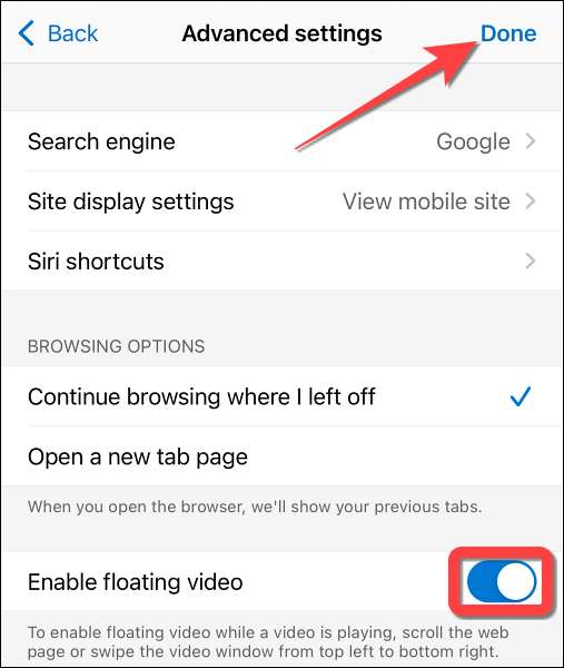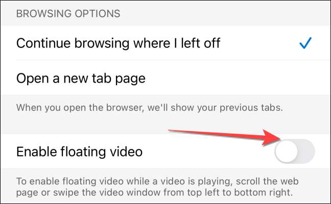 W sekcji "Opcje przeglądania" przełącz opcję "Włącz pływające wideo".