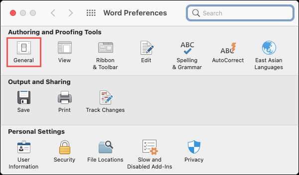 Z dowolnego otwartego dokumentu programu Word, kliknij Word & gt; Preferencje z paska menu. Wybierz "Ogólne".