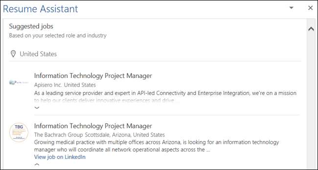 Następnie możesz spojrzeć na sugerowane miejsce pracy paska bocznego. Wyświetla otwarte pozycje wraz z tytułami, lokalizacjami, opisami. Rozwiń sekcję, aby uzyskać więcej i zobaczyć link, aby wyświetlić zadanie bezpośrednio na LinkedIn.