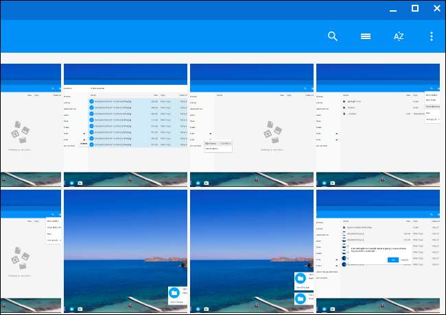 Opcje w prawym górnym rogu okna umożliwiają zmianę widoku, dzięki czemu można wyświetlić siatkę podglądów miniatur zamiast listy plików i sortować pliki według nazwy, rozmiaru, typu lub daty modyfikacji. Jest też przycisk wyszukiwania, który umożliwia szybkie znajdowanie plików.