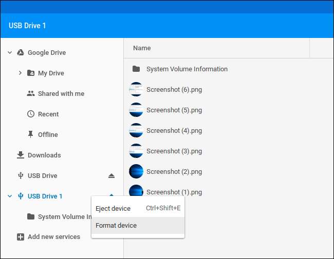 Aby wymazać i sformatować dysk, kliknij prawym przyciskiem myszy nazwę dysku i wybierz „Formatuj urządzenie”. System operacyjny Chrome sformatuje dysk przy użyciu systemu plików exFAT. Nie ma możliwości wybrania innego systemu plików, zmiany układu partycji dysku ani nadania mu nazwy.