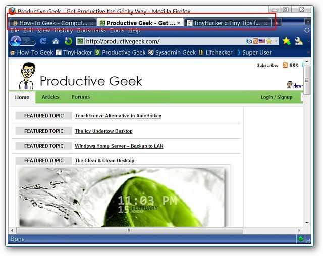 Możesz szybko zmniejszyć rozmiar górnego interfejsu użytkownika po ukryciu niektórych innych pasków narzędzi i pójść jeszcze dalej, jeśli chcesz użyć rozszerzeń, które ukryją „pasek tytułu”. Jest to zdecydowanie dobre rozszerzenie dopasowujące interfejs użytkownika dla każdego, kto używa motywu opartego na Chrome w przeglądarce Firefox.