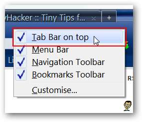 Aby przesunąć „Pasek zakładek” tam iz powrotem między górną i domyślną lokalizacją, po prostu zaznacz / odznacz „Pasek zakładek na górze” w „Menu kontekstowym pasków narzędzi”.