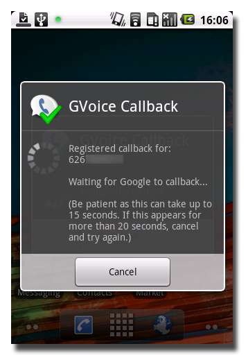 Możesz teraz dzwonić za pomocą wbudowanego dialera telefonu z systemem Android. Kiedy wykonasz połączenie, otrzymasz wyskakujące okienko z informacją, że dzwonisz za pomocą GVoice Callback, a następnie Twój telefon zadzwoni, ponieważ Twój numer Google Voice dzwoni na Twój numer Sipgate.