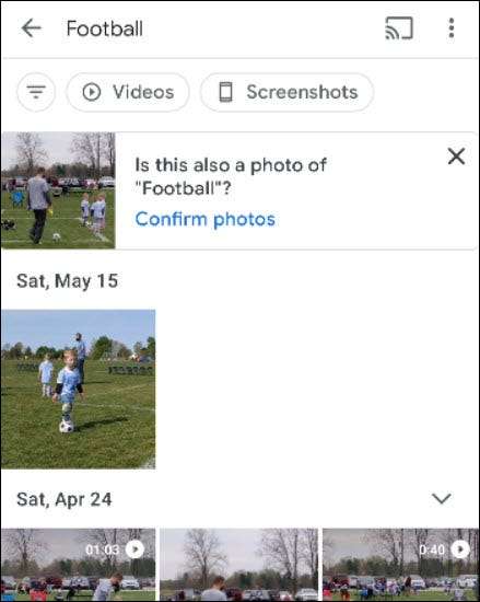 W Google Photos, Powierzchnie przycisków "Mam szczęście" losowe rzeczy w bibliotece. Może pokazać Ci zdjęcia z określonego dnia, lokalizacji lub motywu jak "koszykówka". Po prostu dotknij przycisku i wyświetlysz kilka zdjęć lub filmów, których możesz nie widzieć od jakiegoś czasu.