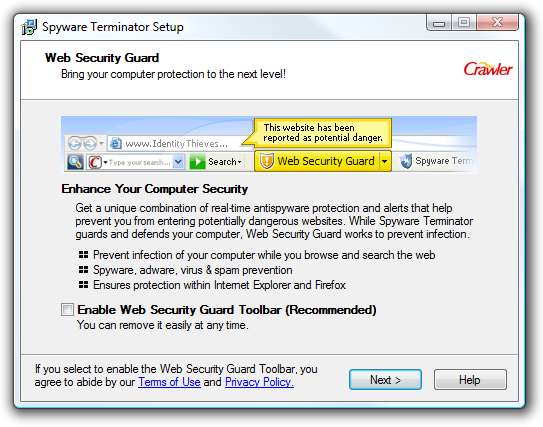 Kolejnym ekranem, o którym należy wspomnieć podczas instalacji, jest pasek narzędzi Web Security Guard. Jak wiesz, w ogóle nie jestem fanem pasków narzędzi, więc odznaczam to. Dodaje dodatkową ochronę podczas surfowania po Internecie, ale zarówno Internet Explorer 7, jak i Firefox 3 same w sobie oferują całkiem przyzwoitą ochronę.