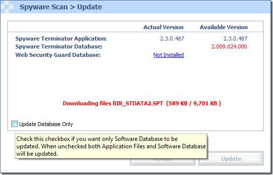Upewnij się i zaktualizuj bazę danych Spyware od razu, naciskając przycisk Aktualizuj. Jeśli chcesz tylko zaktualizować bazę danych, zaznacz pole wyboru obok „Tylko aktualizuj bazę danych”. Jest to dobry wybór do szybkiego skanowania obiektów, jednak warto okresowo odznaczyć tę opcję, aby znaleźć również nowe aktualizacje aplikacji.