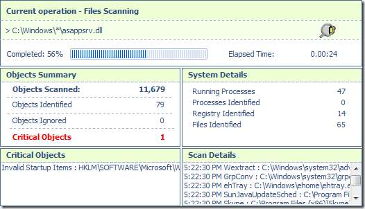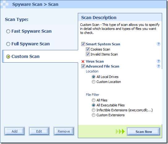 Dostępne są trzy typy skanowania: Szybkie, Pełne i Niestandardowe. Fast sprawdzi tylko system, rejestr i pliki wykonywalne. Podczas gdy Pełne skanowanie wszystkiego, a Niestandardowe pozwala wybrać.